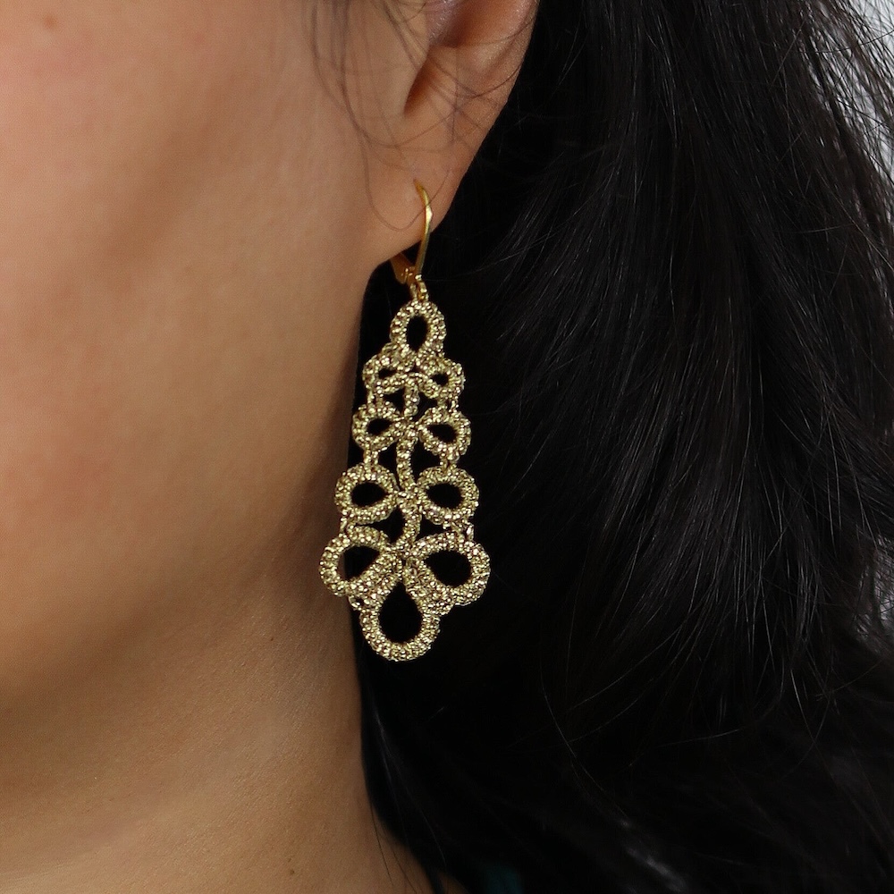 Oorbellen Chantal. Frivolité is een uniek handwerktechniek, waarbij op kant-lijkend weefsel wordt vervaardigd.