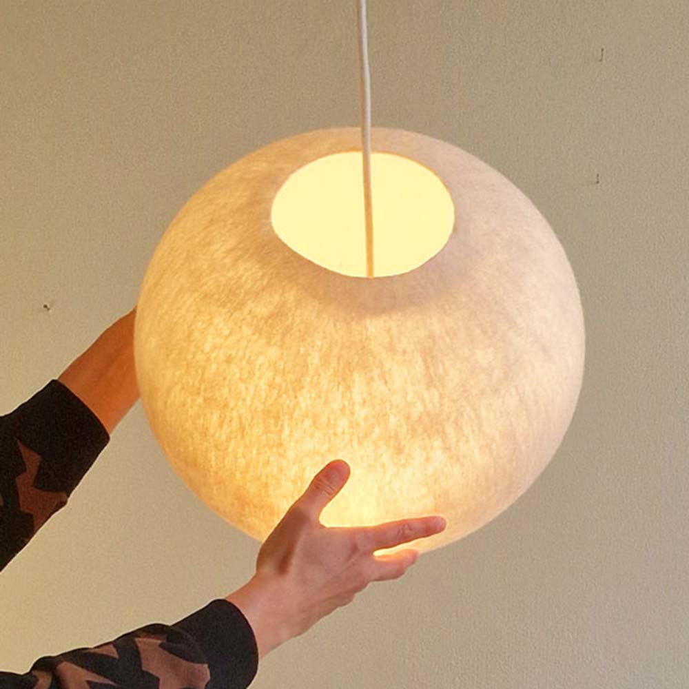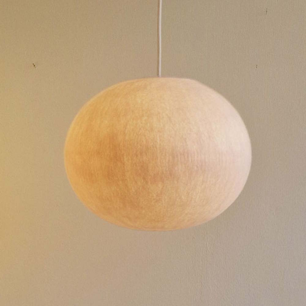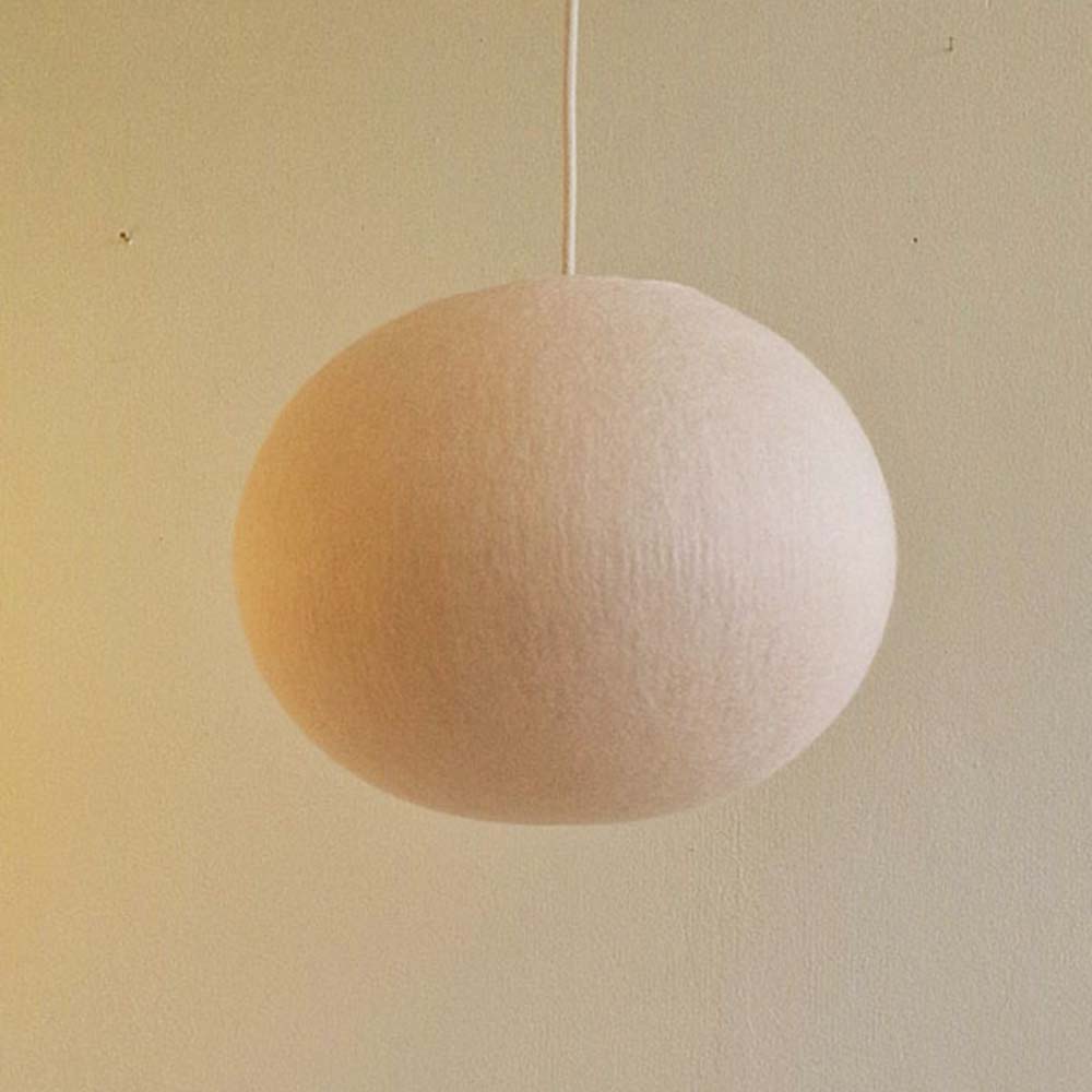Een tijdloze mooie ronde lamp van 100 % schapenwol. De lamp heeft een kleine opening aan de bovenzijde. Aan de onderzijde is mooi het legpatroon van de wol zichtbaar als het licht aan staat. Doordat de onderzijde gesloten is heb je er geen last van dat je in de lichtbron kijkt. Deze ronde lamp is 30 cm breed en 27 cm hoog.