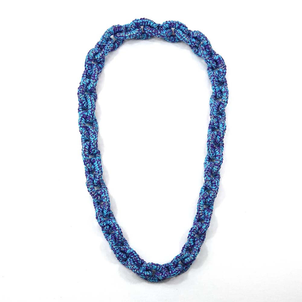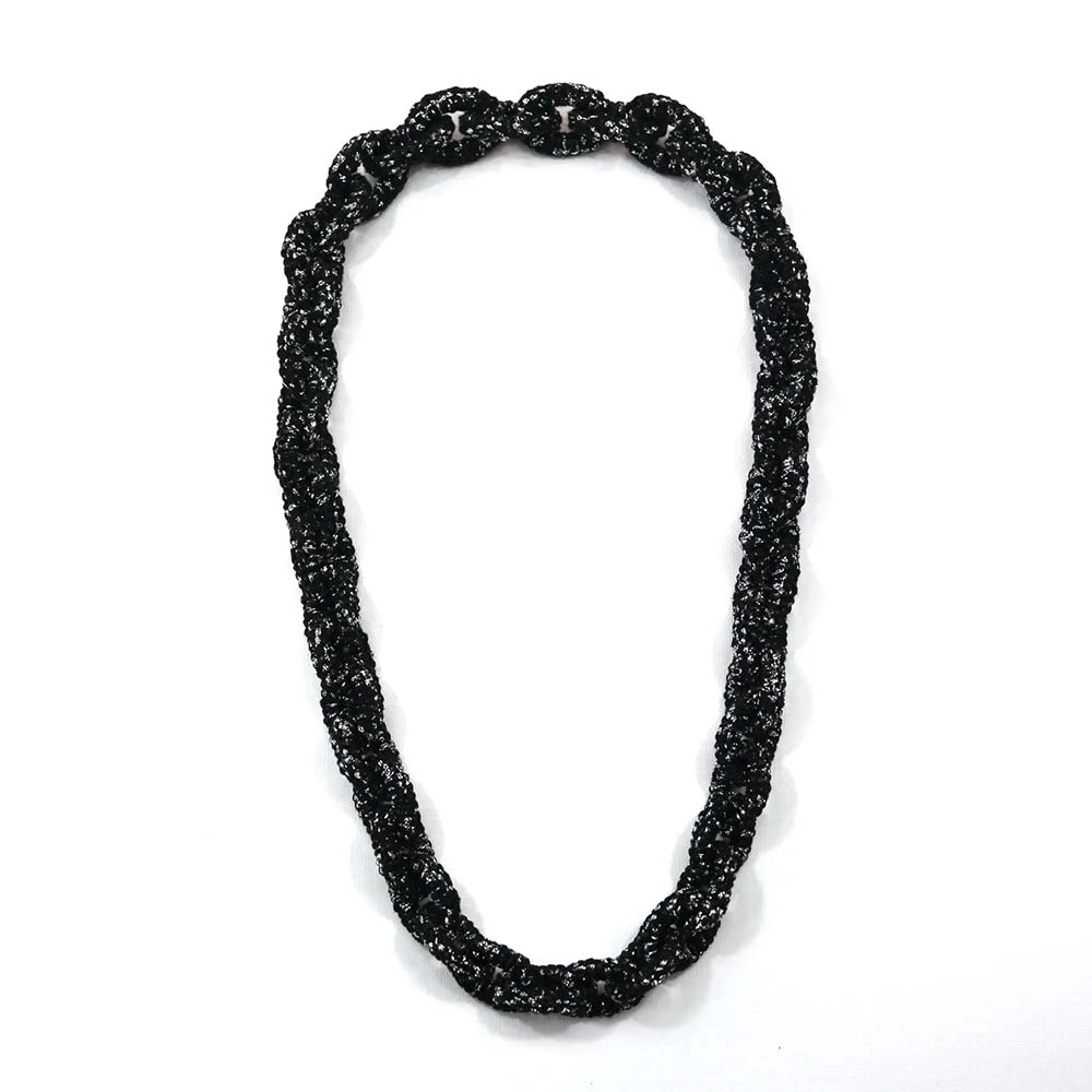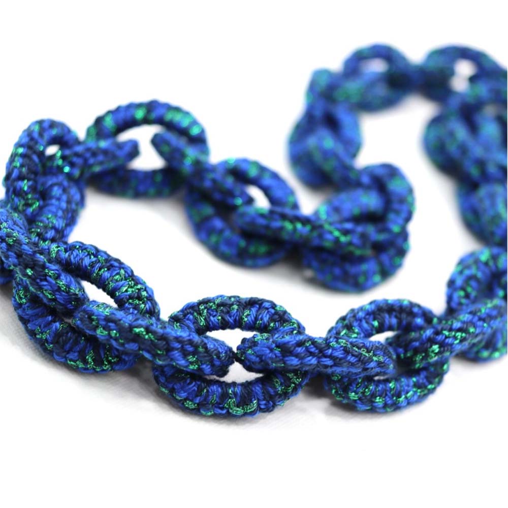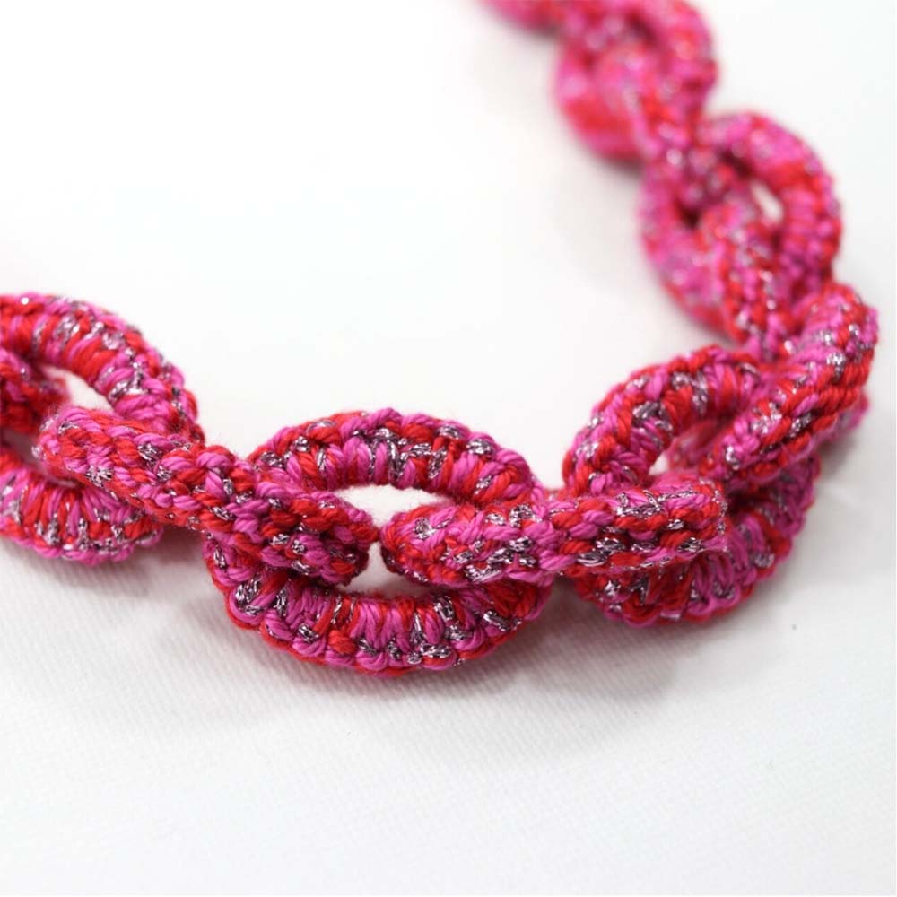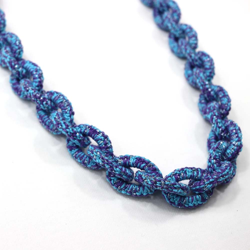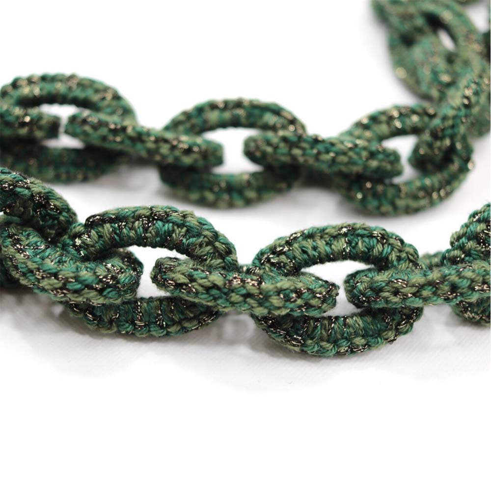 Ketting Jade. Frivolité is een uniek handwerktechniek, waarbij op kant-lijkend weefsel wordt vervaardigd.
