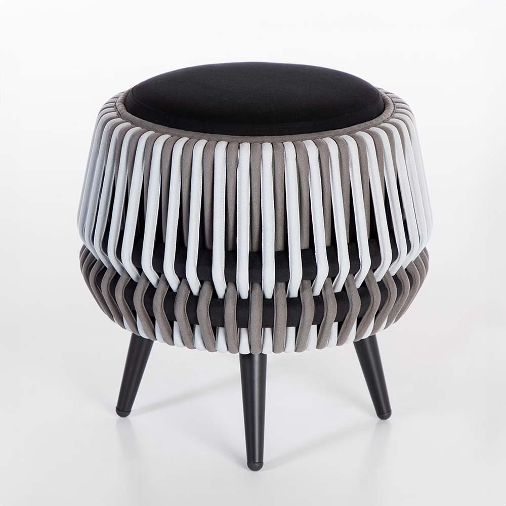 Fili is een vrolijke poef met een verrassend lijnenspel. Een bruikbaar interieur-sieraad voor elke ruimte. De meubelstof is vervaardigd uit gerecyclede petflessen, het gebruik van polyether is bewust tot een minimum beperkt en is er vooral gekozen voor een vulling van katoen om dit ontwerp te realiseren.