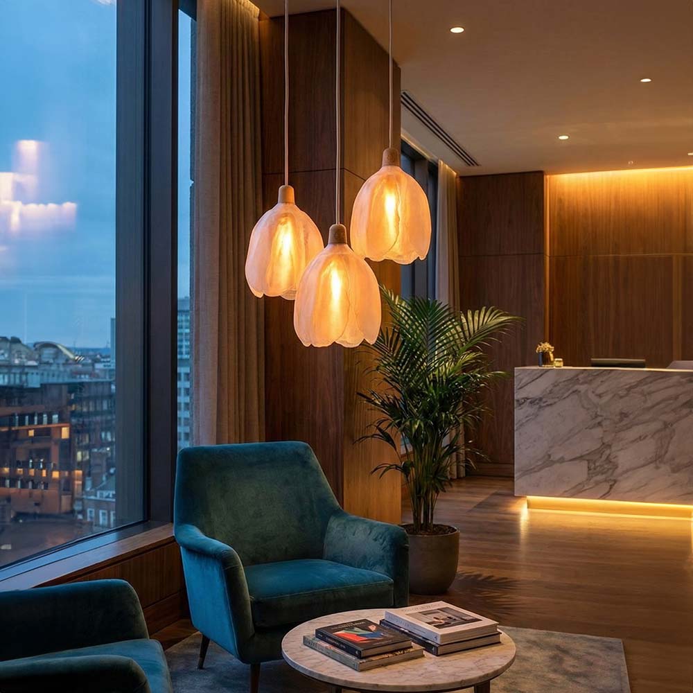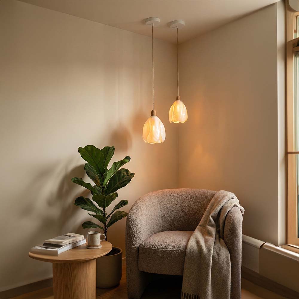De combinatie van witte doorschijnende bloemblaadjes en een houten fitting staat voor de B-natural collectie; verfijnd en gracieus, met natuurlijke flamboyantie.